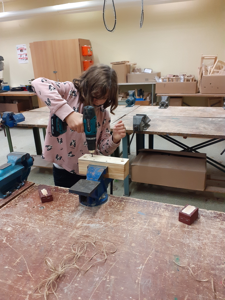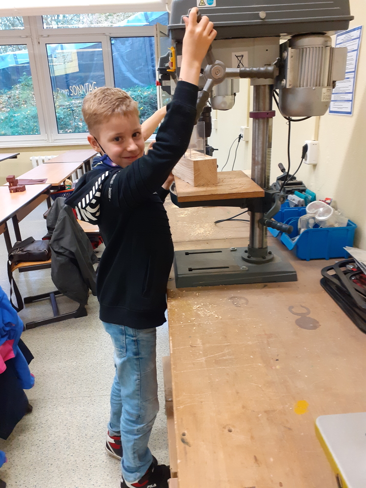 Dieses Mal sollten die Hotels sehr spartanisch werden. Wir haben mit den Kindern gemeinsam in vorher zugeschnittenen ca. 30 cm langen Holzklötzen Löcher im Durchmesser von 6-8mm gebohrt und anschließend die Flächen glatt geschliffen, damit sich die Insekten nicht verletzen.