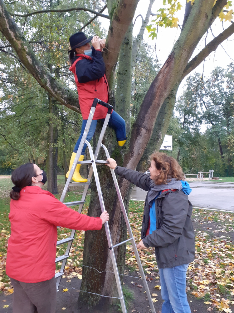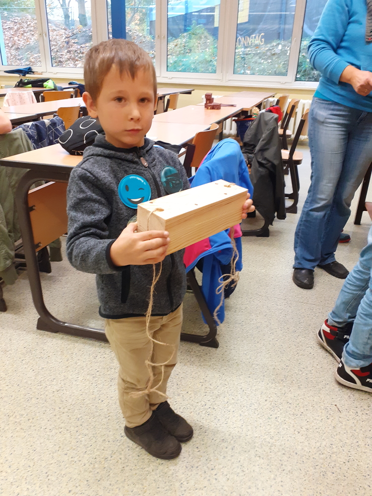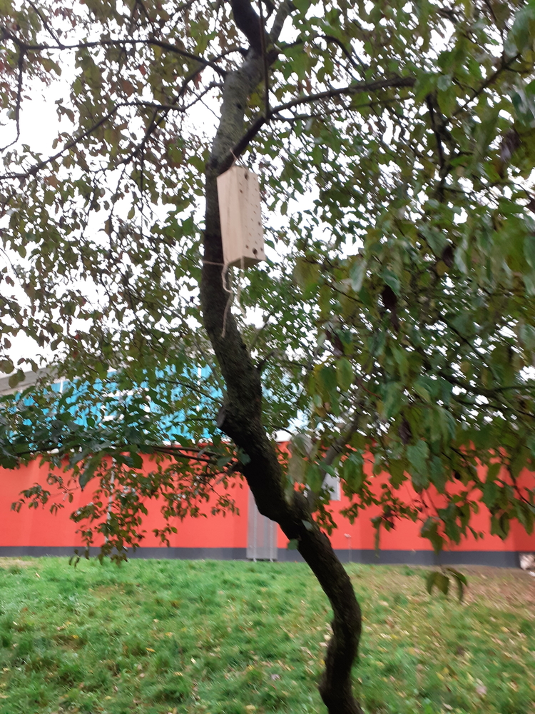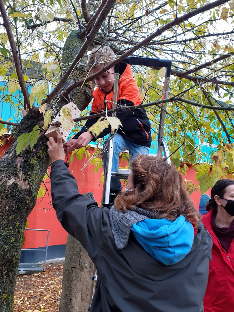 An den Seiten wurden in etwas größeren Löchern Sisalbänder eingefädelt und dann durfte sich jedes Kind einen Baum auf dem Schulcampus aussuchen, an dem sein Insektenhotel angehängt wurde. Das war ein großer Spaß für die Kinder und am Ende hängen jetzt 15 Insektenhotels in den Bäumen des Schulcampus. Wir hoffen, dass die Hotels im Frühjahr und im Sommer gut besucht werden und sich die Bewohner da drin wohlfühlen. Dieses einfache Insektenhotel kann man auch sehr schnell zu Hause nachbauen.