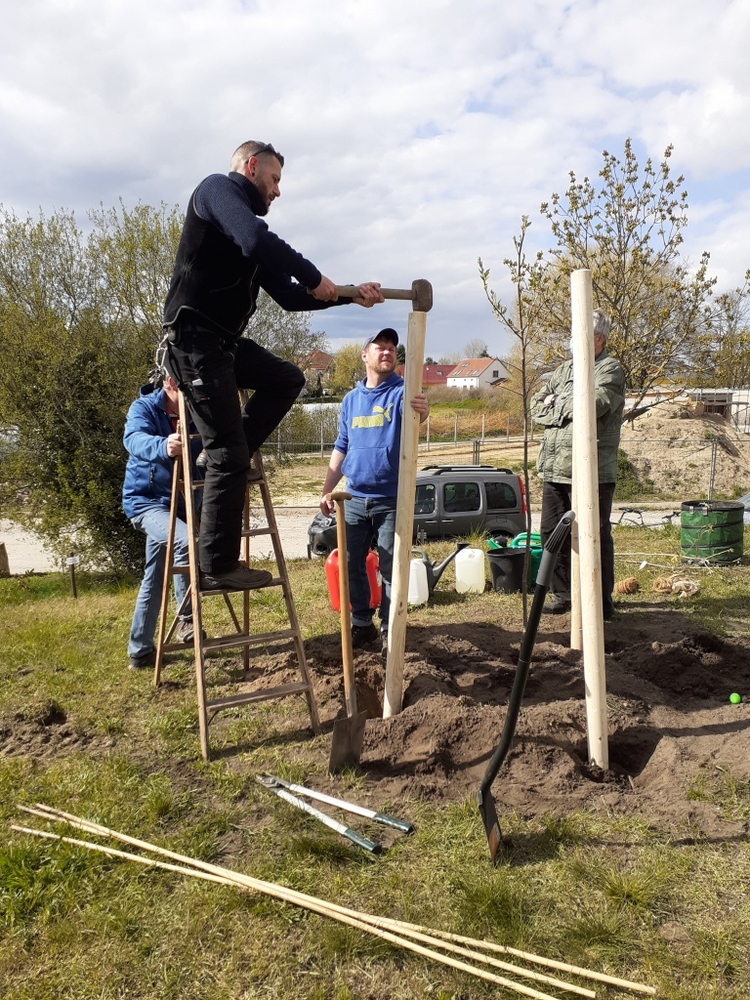 Mit viel Muskelkraft wurde das bereits vom Lehniner Bauhof gut vorbereitete Pflanzloch ausgehoben, bewässert und die Elsbeere anschließend dort eingepflanzt. Dank der professionellen Unterstützung der Baumpflegefirma Kleiber–Tec aus Schenkenberg und der zusätzlichen fachlichen Kompetenz von Herrn Markus Meincke wurde der Baum durch einen Dreibock gestützt, so dass dieser jetzt an seinem neuen, schönen Standort hoffentlich gut anwachsen kann. Ein zusätzlicher Baumbewässerungssack sorgt dafür, dass das Wasser nicht sofort in den Boden fließt, sondern langsam, nach und nach versickern kann. Durch diese sinnvolle Tröpfchenbewässerung über einen Zeitraum von bis zu 9 Stunden, können die Wurzeln der Elsbeere so ausreichend und bedarfsgerecht Wasser aufnehmen.