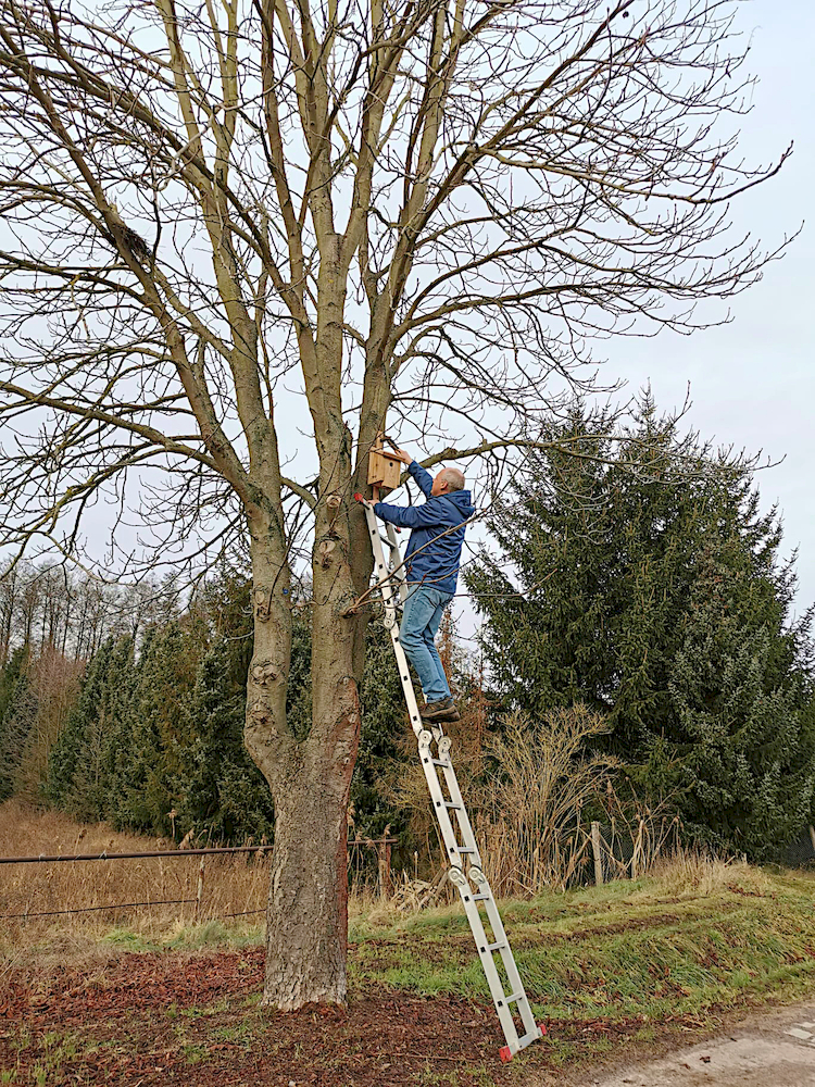Die Nistkästen sollten in zwei bis drei Meter Höhe angebracht werden. Das Einflugloch sollte weder zur Wetterseite (Westen) zeigen, noch sollte der Kasten längere Zeit der prallen Sonne ausgesetzt sein (Süden). Eine Ausrichtung nach Osten oder Südosten ist deshalb ideal. Zur Befestigung an Bäumen eignen sich rostfreie Alu-Nägel, die dem Baum keinen Schaden zufügen. Damit kein Regen eindringen kann, sollte ein Nistkasten nicht nach vorne überhängen. Nisthilfen von gleicher Bauart sollten in Abständen von mindestens zehn Metern aufgehängt werden. So ist sichergestellt, dass die brütenden Tiere auch genügend Nahrung für sich und ihren Nachwuchs finden.