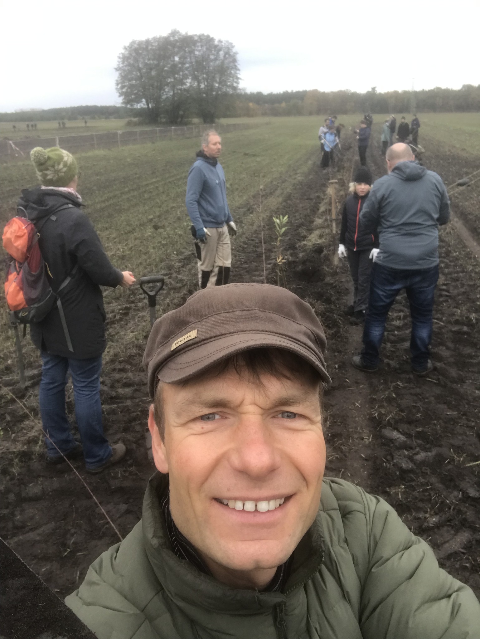 Dort pflanzten wir mit vielen anderen helfenden Händen junge Bäume auf bzw. an den Rand von Äckern eines jungen innovativen Bauern.