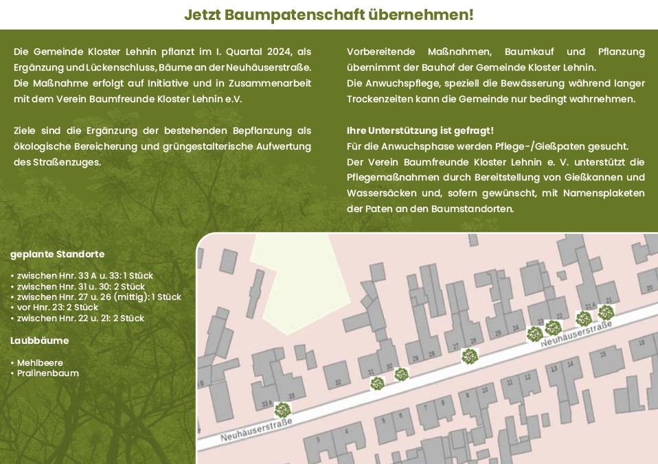 Am Samstag haben die Baumfreunde Kloster Lehnin die Anwohner der Neuhäuser Straße über die im Frühjahr geplanten Baumpflanzungen in ihrer Nachbarschaft informiert. Hierbei wurde auch zur Übernahme von Gießpatenschaften gesprochen, die die Wasserversorgung der jungen Bäume in den Sommermonaten sicherstellen sollen. Die Mehrzahl der Anwohner freute sich über die geplante Begrünung ihrer Straße und die Bereitschaft zur Mithilfe bei der Bewässerung war groß.