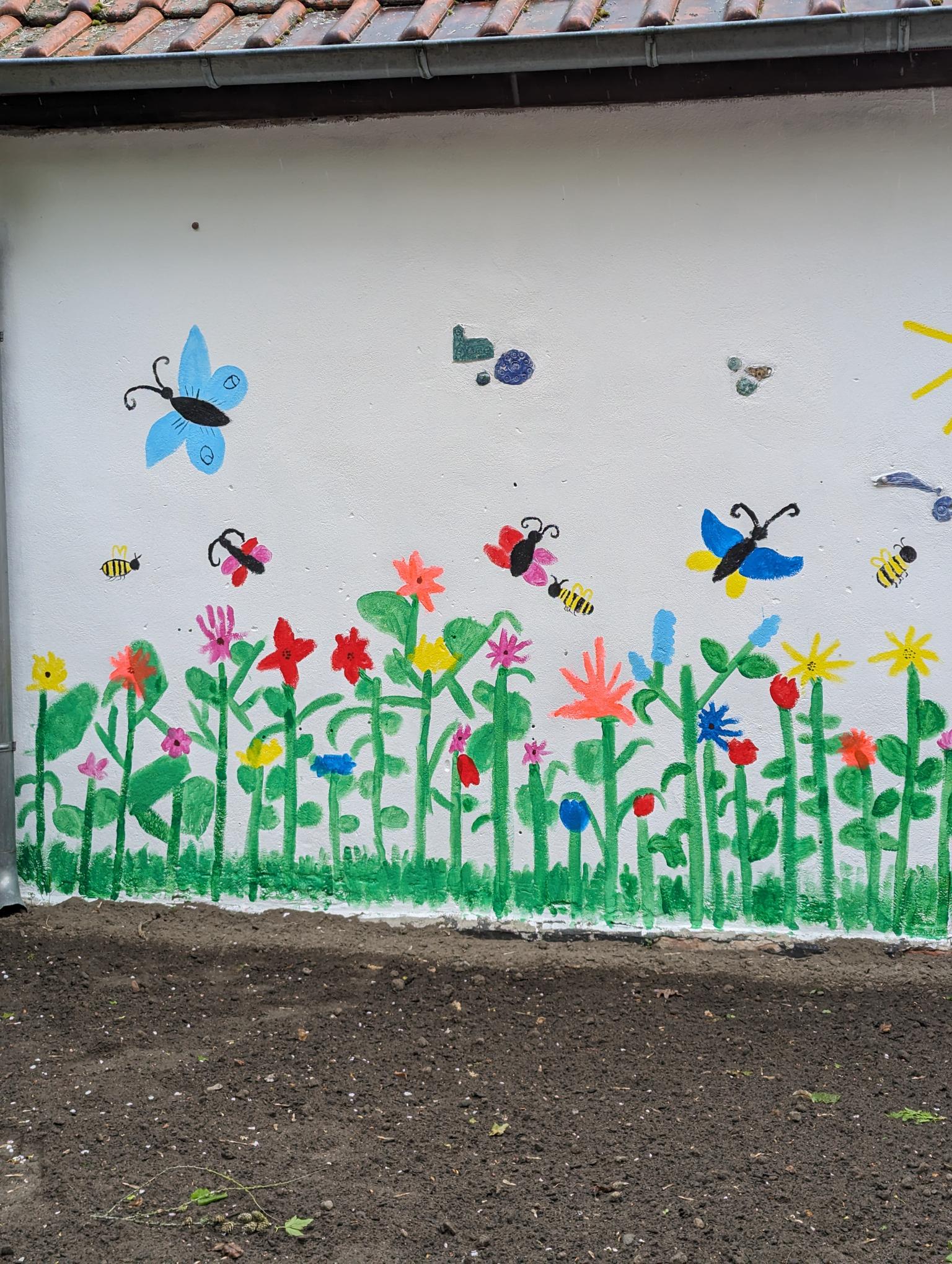 Der Boden für die zukünftige Wiese wurde vorab vom Bauhof für unsere Zwecke vorbereitet. Hierfür möchten wir uns noch einmal ganz herzlich bedanken. Die Kinder haben die Wände rund um das Blühwiesenareal mit wunderschönen Blumen und Insekten bemalt und zwei Erzieher: innen haben um das Gelände herum noch einen kleinen Zaun gebaut.