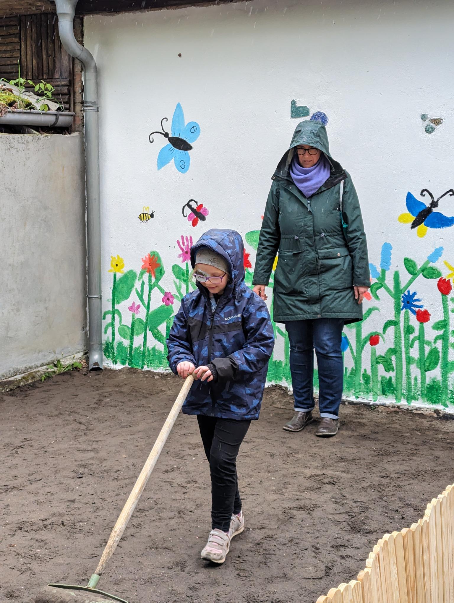 Pünktlich zur verabredeten Zeit stürmten die Kinder bei strömendem Regen- und somit bestem Säewetter aus dem Kindergarten auf uns zu. Fröhlich und wissbegierig wurden wir von ihnen begrüßt.