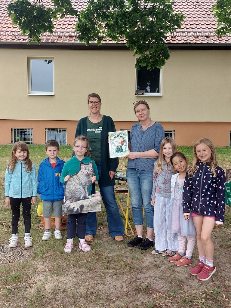 Am Montag, dem 27. Mai waren die Baumfreunde wieder bei den Bärenkindern der Kita Knirpsentreff zu Gast. Im Rahmen des Waldprojekts der Kinder ging es dieses Mal um ein besonderes Waldtier – die Wildkatze. Sabine und Antje hatten viel zu dem flauschigen Jäger zu berichten. Und das nicht ohne Anlass: Nachdem die Wildkatze in den brandenburgischen Wäldern rund 200 Jahre als ausgerottet galt, wandert sie hier aktuell aus anderen Gebieten wieder ein. Seit 2020 gibt es ein Projekt des Landesamtes für Umwelt in Kooperation mit dem BUND, in dem Wildkatzen in der Region nachgewiesen werden. Dies ist möglich anhand einer genetischen Untersuchung eingesammelter Haarproben. Im Fläming gelang dies bereits. Beim „Wildkatzenmonitoring“ helfen die Baumfreunde seit 3 Jahren ehrenamtlich mit und beobachten die Waldgebiete in und um Lehnin.