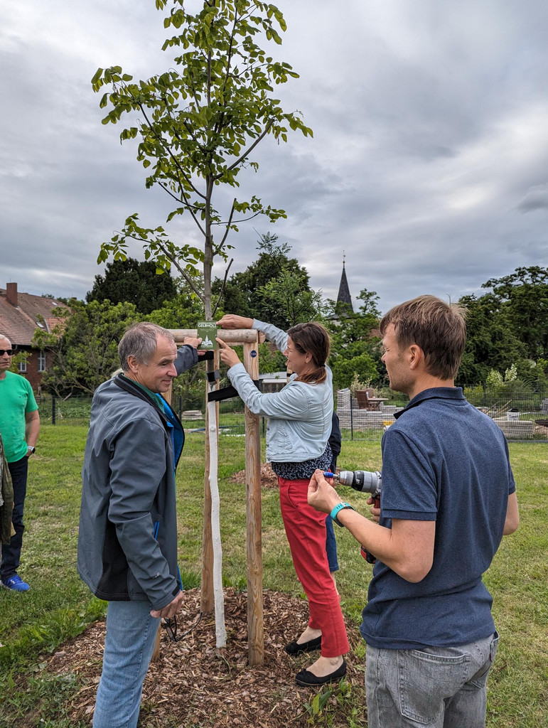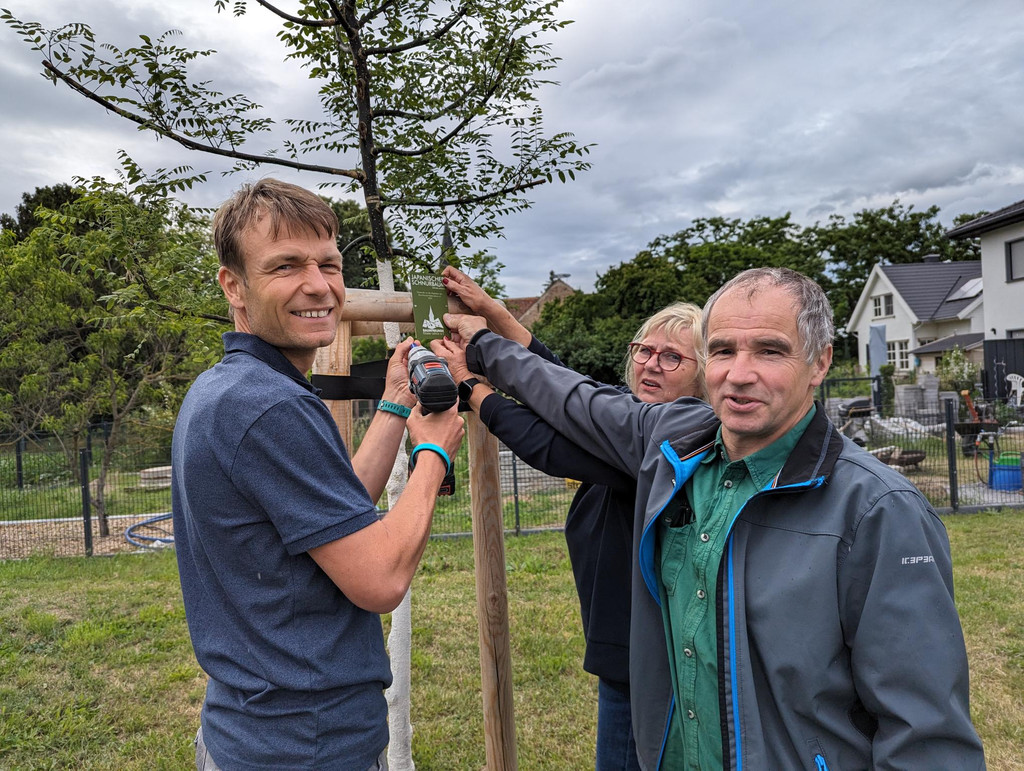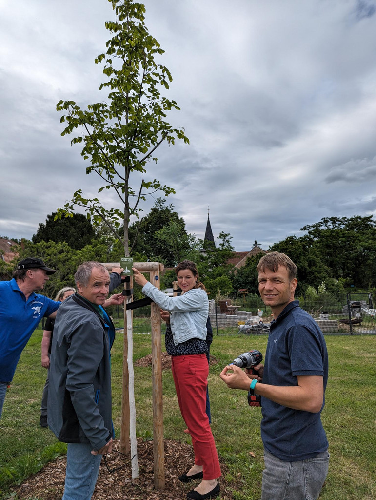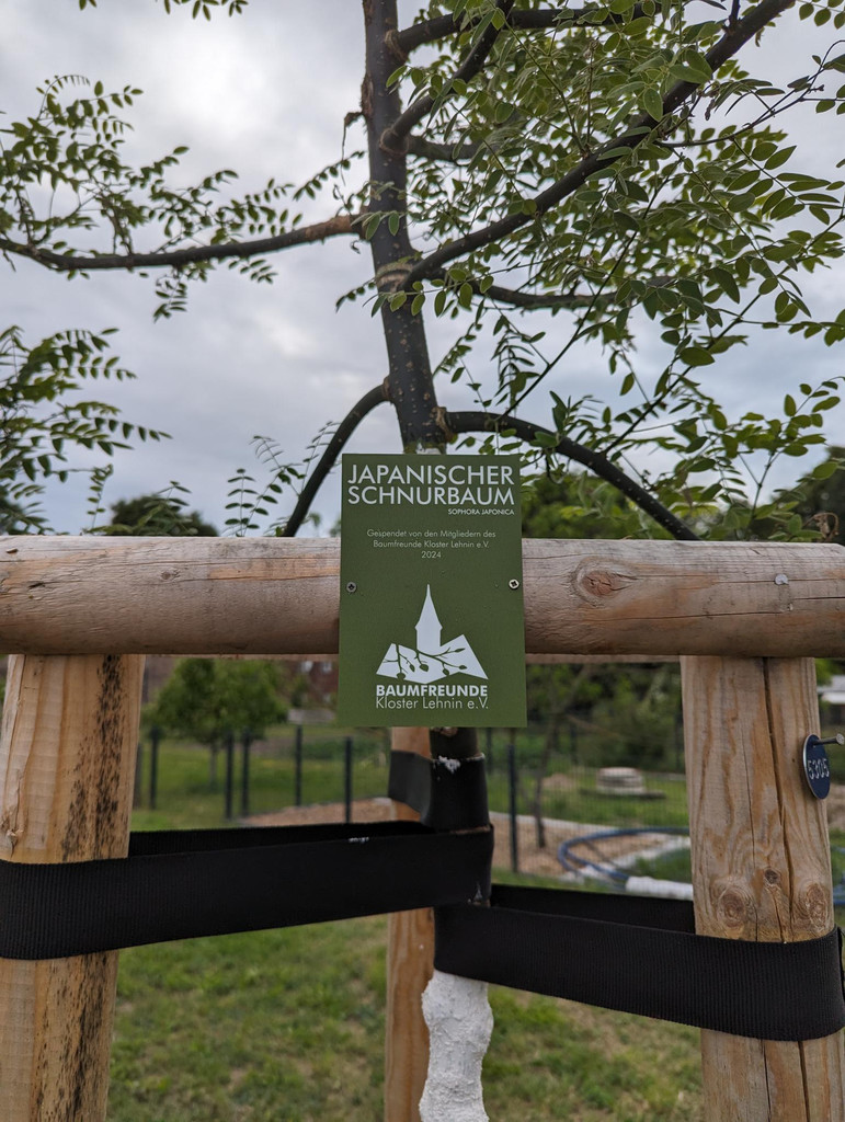Es handelt sich dabei um einen Japanischen Schnurbaum (Sophora japonica) und ein Amerikanisches Gelbholz (Cladrastis lutea). Beides sind insektenfreundliche Pflanzen, die aufgrund der geänderten klimatischen Bedingungen mittlerweile auch hier in Europa verbreitet sind. In der letzten Woche fand die offizielle Spendenübergabe unseres Vereins an die Netzener Kollegen vor Ort statt, indem wir zusammen an beiden Bäumen unsere Schilder zur Kennzeichnung der gesponsorten Bäume anbrachten.