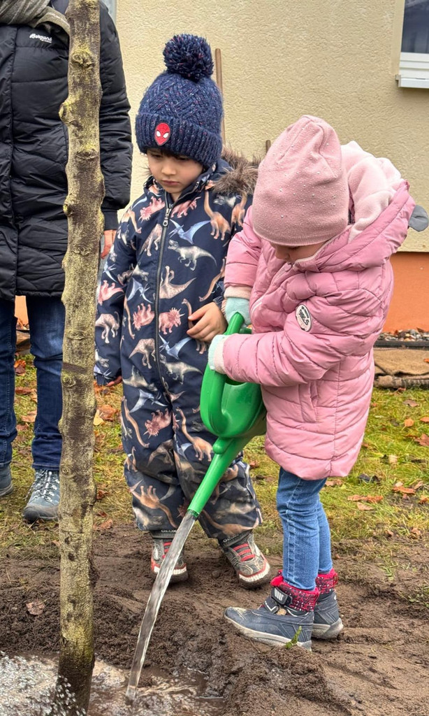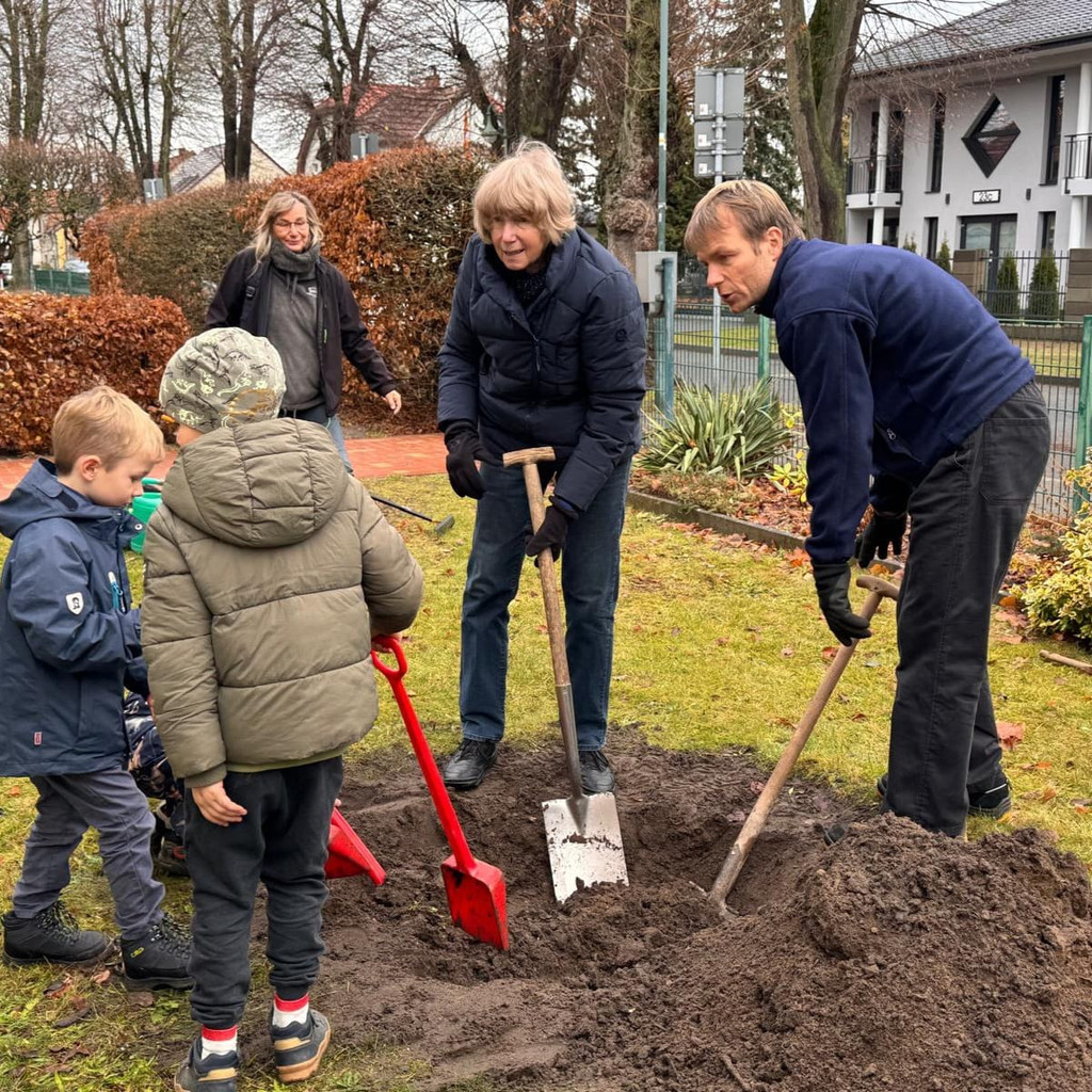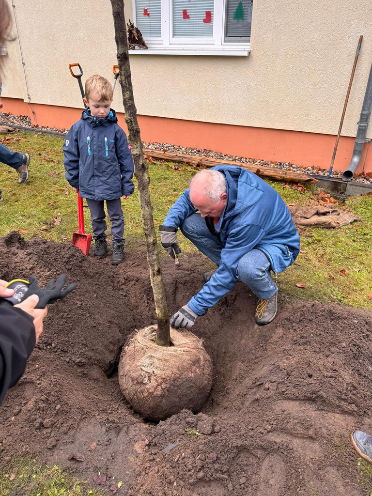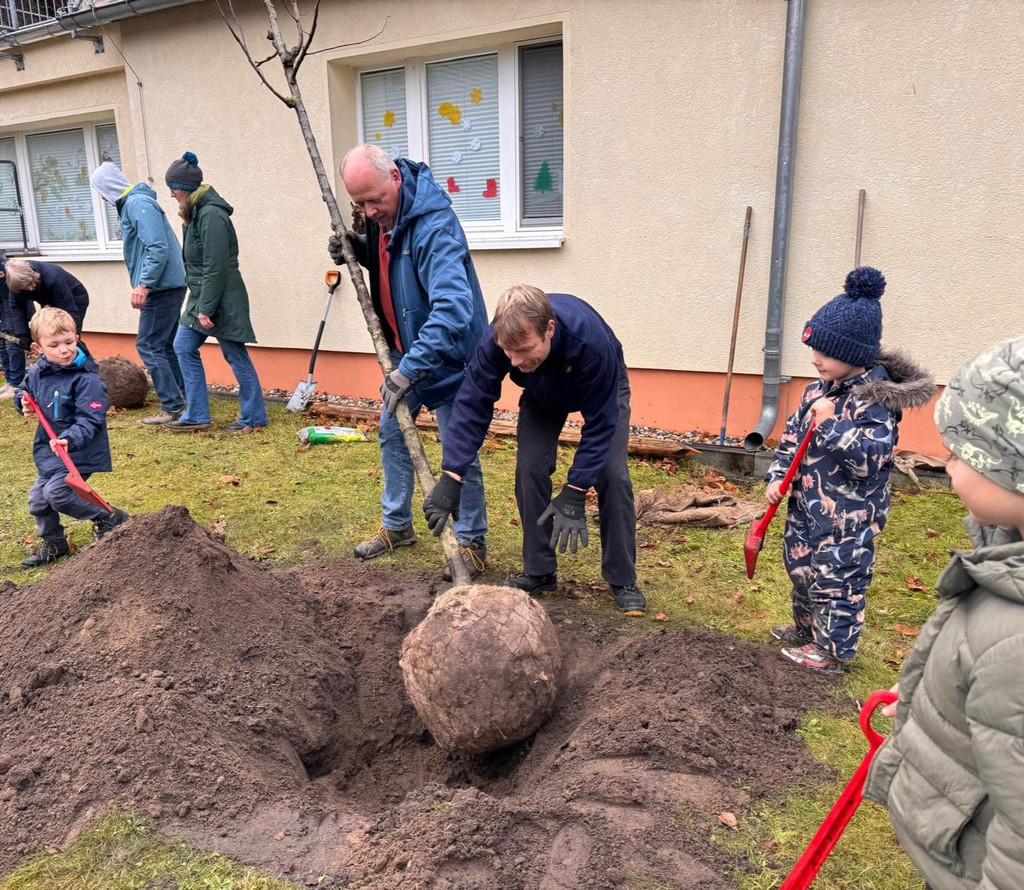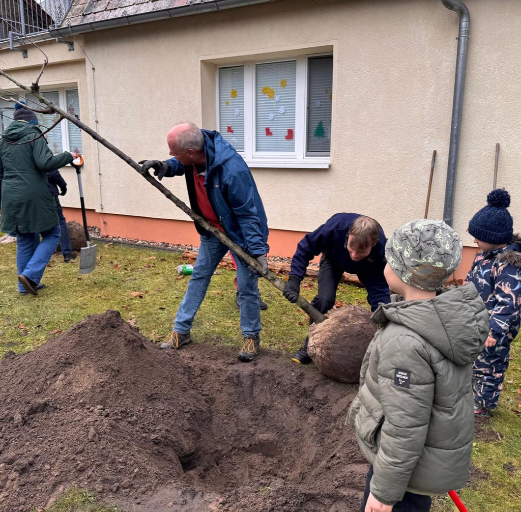 Die Baumfreunde pflanzen mit den Kindern der Kita Knirpsentreff zwei Bäume