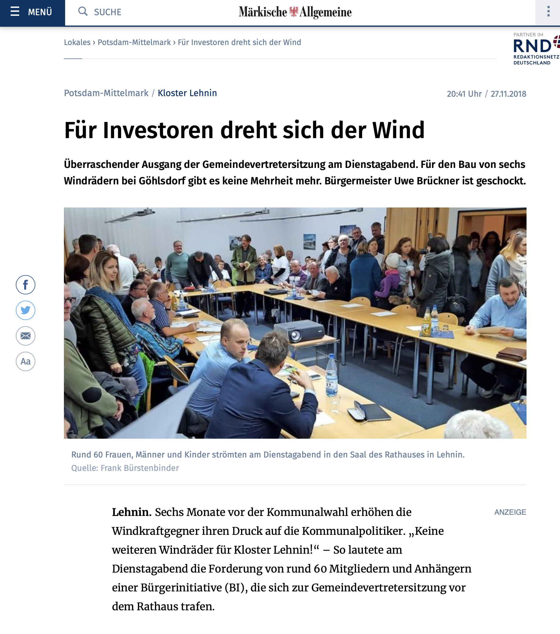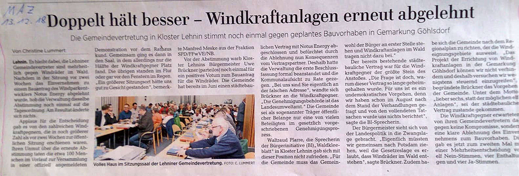 Märkische Allgemeine (MAZ) berichtet über den Ausgang der Gemeindevertretersitzung in Kloster Lehnin
