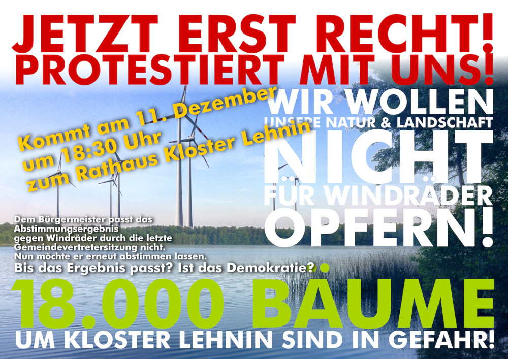 Auf Druck der öffentlichen Meinung, angeführt von den Mitgliedern des BAUMFREUNDE Kloster Lehnin e.V., lehnten die Kloster Lehniner Gemeindevertreter am Dienstag den 27.11.2018 mit großer Mehrheit ihr Einvernehmen zu einem Bauantrag des Potsdamer Windparkentwicklers Notus Energy ab. Vor diesem Hintergrund findet am Dienstag, 11.12.2018 um 19.00 Uhr im Rathaus der Gemeinde Kloster Lehnin, Friedensstr. 3 eine Gemeindevertretersitzung statt, auf der das Thema erneut auf der Tagesordnung steht.