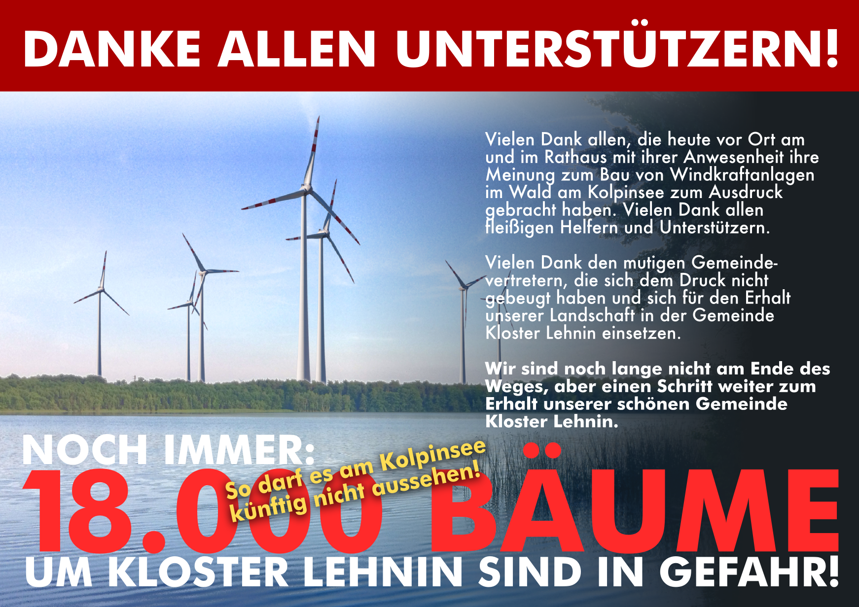 Erneut hat sich die Mehrheit der Gemeindevertreter gegen die Errichtung von Windkraftanlagen in namentlicher Abstimmung ausgesprochen. Mit großem Respekt danken wir den Gemeindevertreter, die sich dem Druck nicht gebeugt haben und sich für den Erhalt unserer Landschaft in der Gemeinde Kloster Lehnin einsetzen.