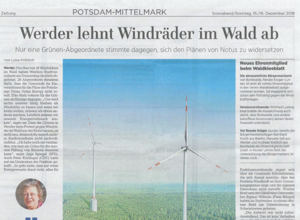Werder. Den Bau von 18 Windrädern im Wald haben Werders Stadtverordnete am Donnerstag (A. d. R. 13.12.2018) deutlich abgelehnt. 26 Abgeordnete stimmten dafür, dass die Gemeinde ihr Einvernehmen für die Pläne der Potsdamer Firma Notus Energy nicht erteilt.