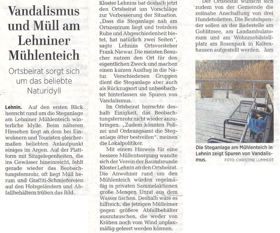 Kloster Lehnin bat deshalb jetzt den Ortsbeirat um Vorschlage zur Verbesserung der Situation. "Dass die Steganlage nah am Ortszentrum liegt und trotzdem Ruhe und Abgeschiedenheit bietet, hat natürlich zwei Seiten", sagte Lehnins Ortsvorsteher Frank Niewar. Die meisten Besucher nutzen den Ort für den eigentlichen Zweck und machen einen kurzen Ausflug in die Natur. Verschiedenen Gruppen dient die Steganlage aber auch als Rückzugsort und unbeobachtet hinterlassen sie Spuren von Vandalismus. Im Ortsbeirat herrschte deshalb Einigkeit, das Beobachtungsfernrohr nicht wieder anzrubringen. „Zudem könnten Polizei und Ordnungsamt die Steganlage öfter bestreifen“, meinen die Lokalpolitiker. Mit einem Hinweis für eine bessere Müllentsorgung wandte sich der Verein der Baumfreunde Kloster Lehnin an den Ortsbeirat. Die Anwohner rund um den Mühlenteich würden regelmäBig in privaten Sammelaktionen groBe Mengen Unrat aus dem Wasser fischen. Deshalb wäre es hilfreich, die jetzigen Mülleimer gegen größere Abfallbehälter auszutauschen, die weder von Krähen noch vom Wind unplanmäßig geleert werden können.