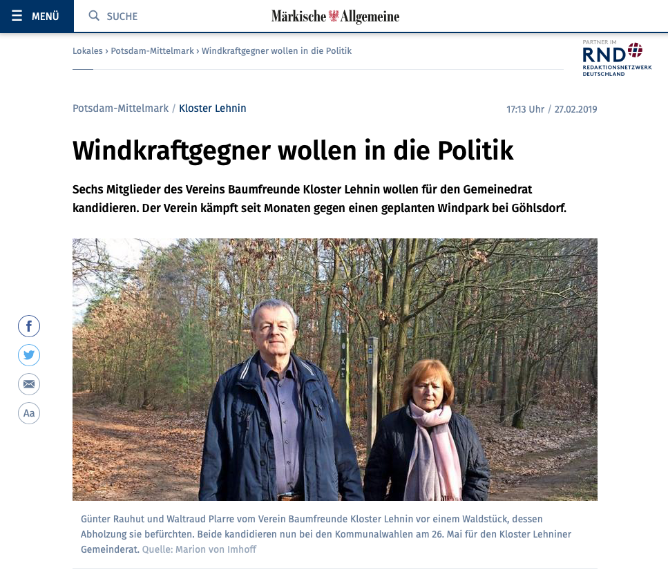 Sechs Mitglieder des Vereins Baumfreunde Kloster Lehnin wollen für den Gemeinedrat kandidieren. Der Verein kämpft seit Monaten gegen einen geplanten Windpark bei Göhlsdorf.
