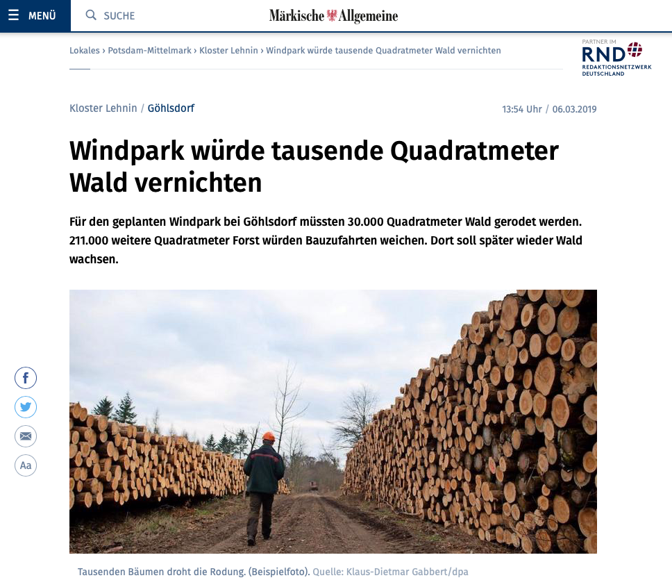 Der geplante Windpark bei Göhlsdorf, Bliesendorf und Ferch mit derzeit 18 geplanten Anlagen wird knapp 30.000 Quadratmeter Wald dauerhaft zerstören. Das geht aus einer Auflistung des Landesumweltamtes hervor, die der MAZ auf Anfrage vorliegt...