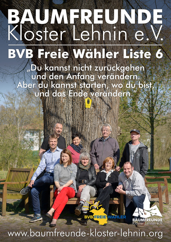 Mitglieder des Baumfreunde Kloster Lehnin e.V. stellen sich zur Kommunalwahl in Brandenburg 2019, am 26. Mai 2019, den Wählern der Gemeinde Kloster Lehnin mit einer eigenen Liste zur Wahl.