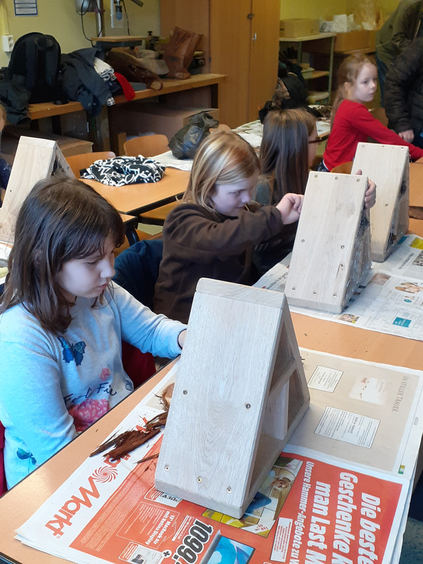 Für die Wintermonate haben wir uns überlegt, mit den Baumfreunde-Kindern der ITBL etwas für die Vögel und Insekten zu basteln. So trafen wir uns am letzten Schultag vor den Weihnachtsferien und hatten vorgearbeitete Insektenhotels für die Kinder im Gepäck...