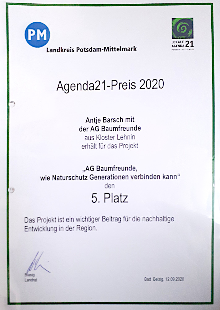 Preisverleihung der Lokalen Agenda 21 des Landrates am 12.9.2020 für die AG Baumfreunde ( 5.Platz)